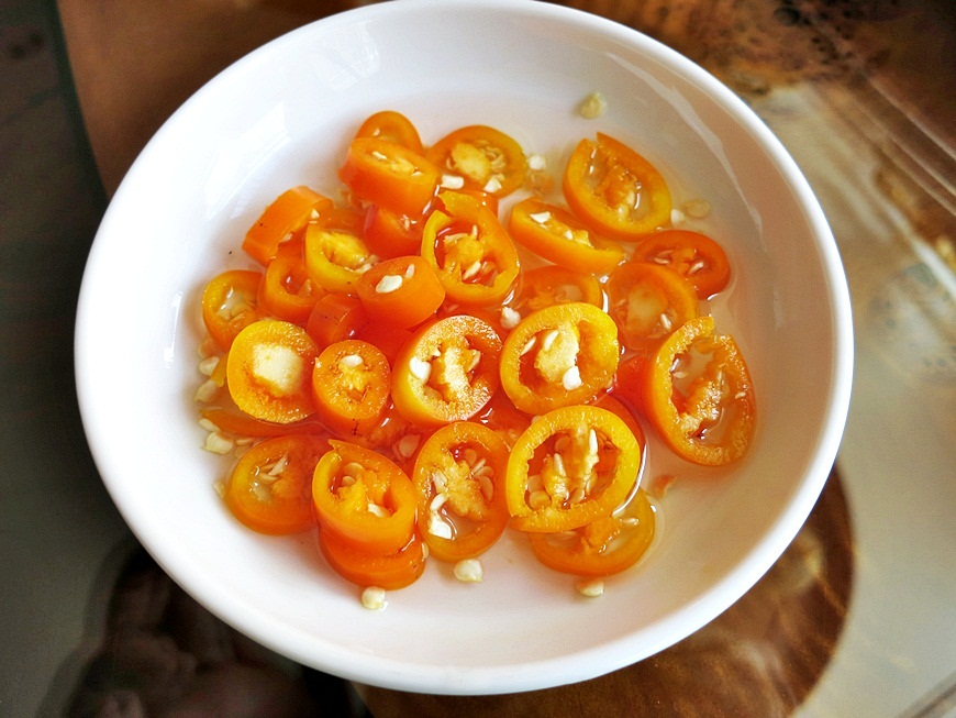 - ผักชีเด็ดช่อ, พริกชี้ฟ้าเขียว-เหลือง-แดง ดองน้ำส้ม, พริกแห้งคั่วบด, พริกไทยป่น