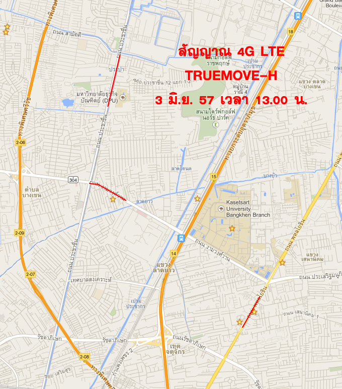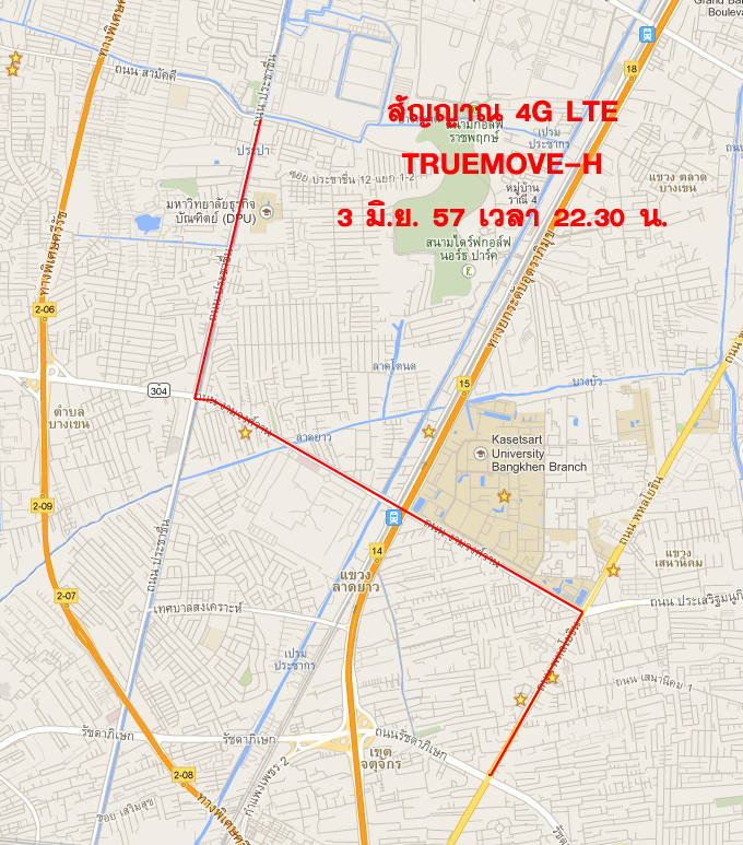 (หมายเหตุ สัญญาณ 4G ที่จับได้บนถนนจะขึ้นเป็นเส้นสีแดงๆ นี่เป็นคร่าวๆนะครับ ไม่เป๊ะ แต่เป็นช่วงๆประมาณนี้)