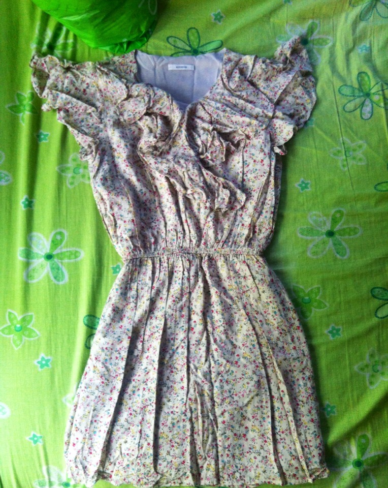 2. เดรสผ้าคอตอนนิ่มากลายดอกไม้เล็กๆ ระบายแขนและอก ขนาด อก 36 เอวยางยืดค่า สะโพกฟรี สภาพ 85% ราคา 80 บาท