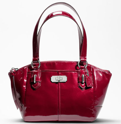A satchel on a small scale, with a darling, fan-shaped silhouette in extra-smooth patent leather. The rich, glossy color is a perfect backdrop for the simple hardware and pretty mirrored turnlock.
