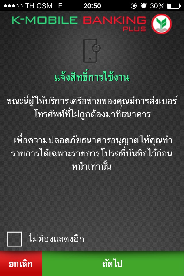วันนี้ได้เข้าใช้งาน k-mobile banking ในมือถือ iphone ผ่าน application ของกสิกร ปรากฏว่าระบบแจ้งหน้าจอตามนี้