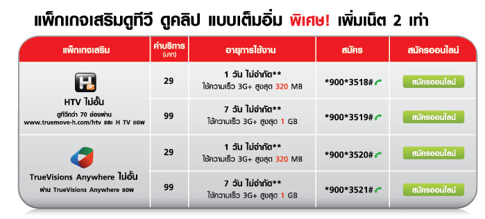 รับสิทธิ์ 3G/EDGE 1 วัน / สิทธิ์ ลูกค้าแพ็คเกจแบบไม่จำกัดปริมาณ รับฟรี 320 MB / สิทธิ์ ลูกค้าแพ็คเกจอื่น ๆ รับฟรี 320 MB Unlimited/ สิทธิ์ ช่องทางรับสิทธิ์ รับสิทธิ์ผ่านมือถือทรูมูฟ เอช กด *878*2*1