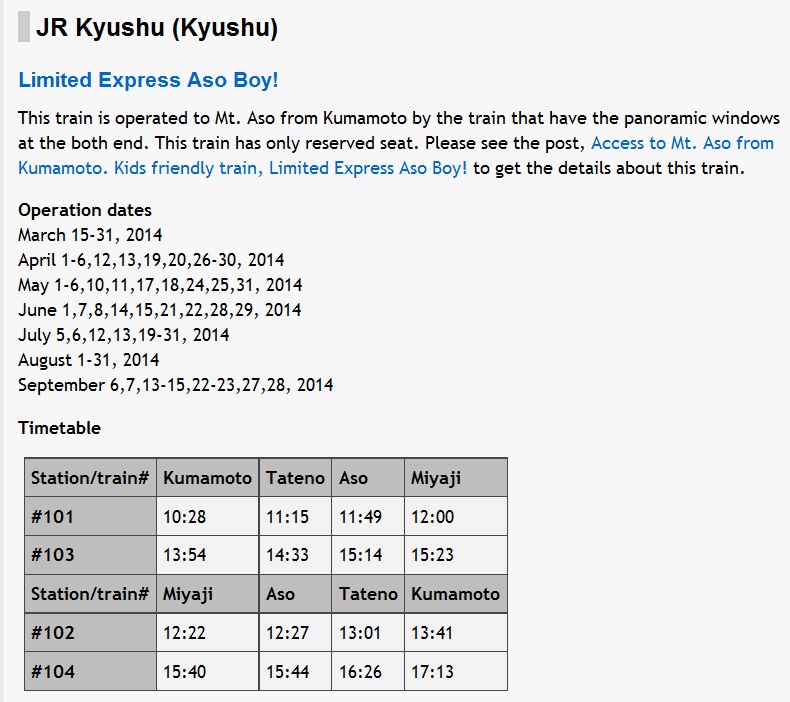 5-15 ตุลาผมกับครอบครัวมีโปรแกรมไป ญี่ปุ่นแถบคิวชู 10 วัน โดยส่วนใหญ่จะขับรถเที่ยวเองเกือบทั้งทริปคับ แต่วันเสาร์ที่ 10 จาก Aso ไป Kumamoto จะนั่ง Aso Boy ติดปัญหาคือตารางการเดินรถช่วงตุลายังไม่ออกเลย