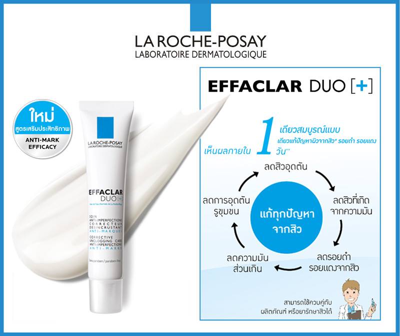 EFFACLAR DUO [+] เค้าเครมว่า ช่วยขจัดปัญหาเรื่องสิวและการอุดตันของรูขุมขน รวมถึงรอยดำรอยแดงให้หมดไป ด้วยมอยส์เจอร์ไรเซอร์ EFFACLAR DUO [+] ผู้ช่วยในการบำรุงผิวหน้าที่สามารถใช้เป็น make-up base ได้อย่างดี และรอยแดงจากการอักเสบ ด้วยส่วนผสม Procerad หลังใช้ภายใน1วัน จะช่วยลดรอยแดงได้