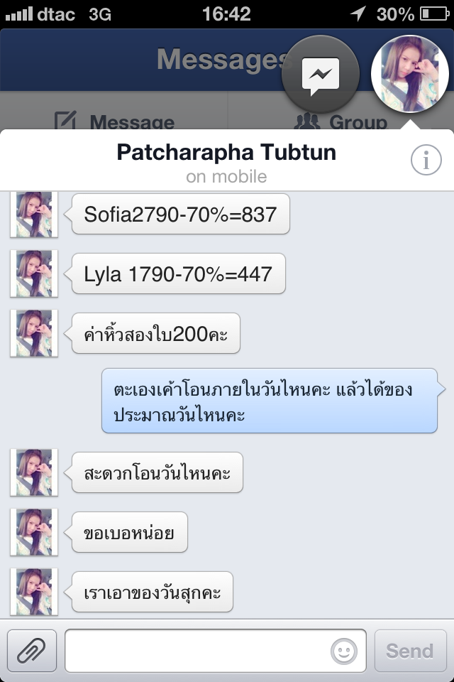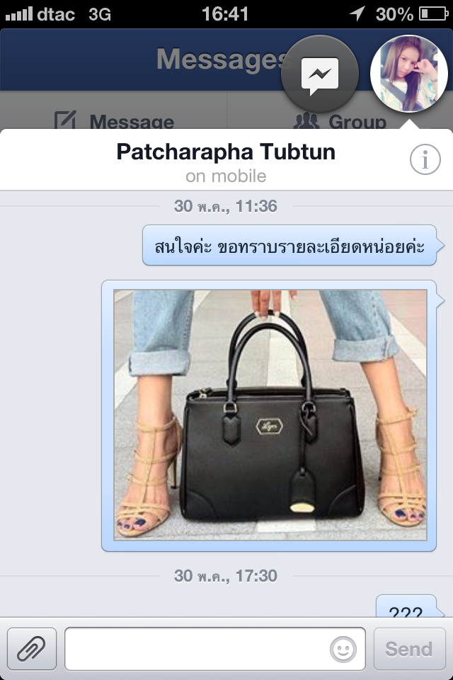 ชั่งใจไปมาอยู่หลายชั่วโมง จึงข้อความไปหาแม่ค้า (แคปชั่นโพสที่นางรับหิ้วอันแรก หาไม่เจอค่ะ รู้ตัวเมื่อสายนางปิดเฟซบุ๊คไปแล้ว)