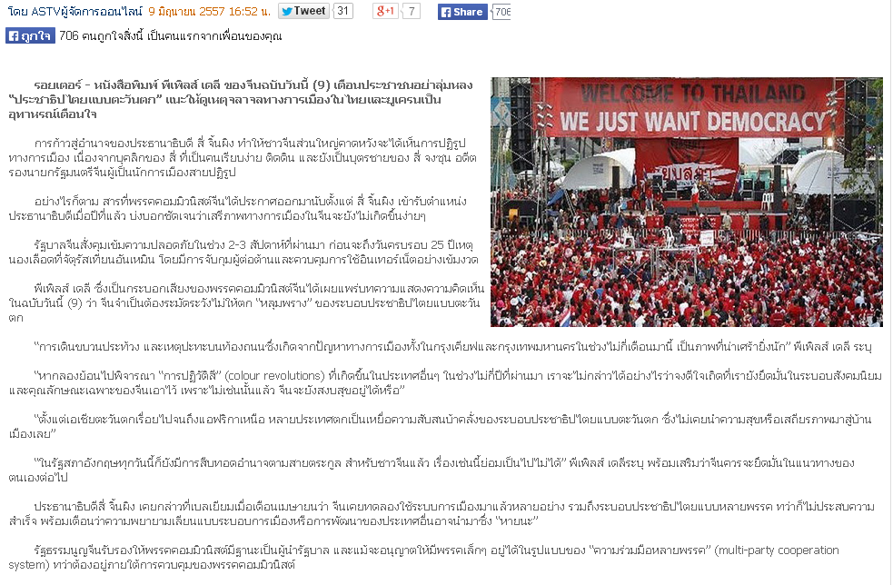 แต่สื่อฯ จีน กลับบอกว่า ประชาธิปไตยแบบตะวันตก ไม่เหมาะสมกับประเทศไทย "