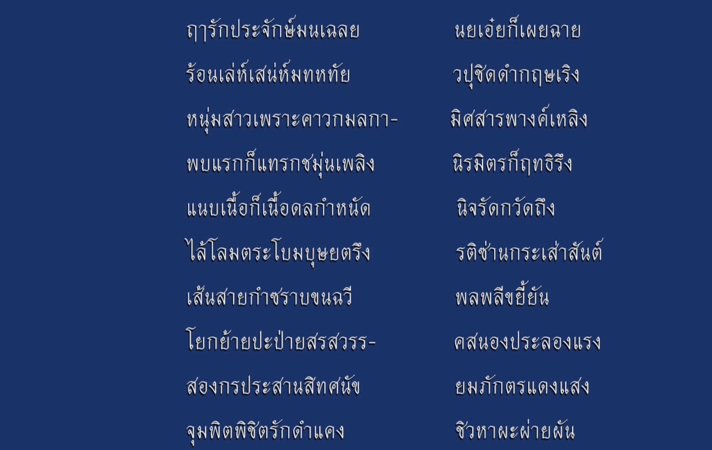 วสันตดิลกฉันท์ ๑๔ @ โอ้โอสหาย สติคะนึง...........นยะซึ่ง ประกอบเป็น รูปนามก็แค่ ภวะจะเห็น............บ่มิควร ประเด็น"หลง" @ สิ่งสรรพ(ะ)ล้วน มตะมลาย.....สิบ่สาย มุธรรมคง แม้ทุกข(ะ)ท้น ก็จะป