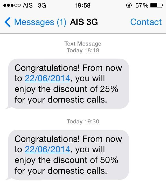AIS ใครได้รับ SMS ส่วนลดการโทรในประเทศ 25% , 50% บ้างครับ