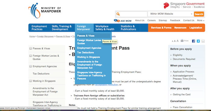 http://www.mom.gov.sg/foreign-manpower/passes-visas/training-employment/before-you-apply/Pages/default.aspx