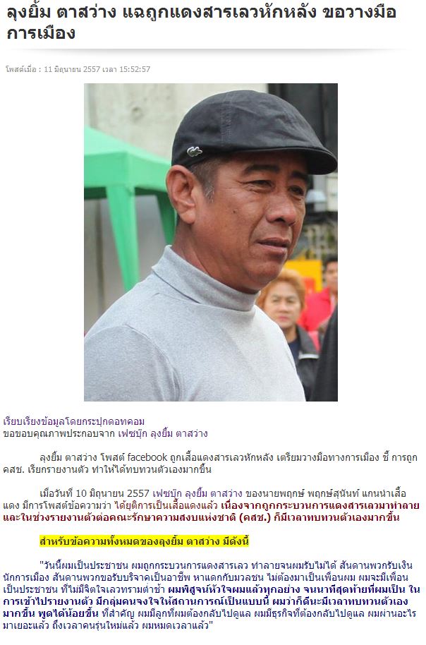 ลุงยิ้ม ตาสว่าง ประกาศวางมือทางการเมือง หลังแฉเสื้อแดงหักหลัง ย้ำ ขอตัวไปอยู่ดูแล ลูกเมีย และธุรกิจ 11 มิ.ย. 57 ผู้สื่อข่าวรายงานว่า นายพฤกษ์ พฤกษ์สุนันท์ ได้โพสต์ข้อความลงเฟซบุ๊คส่วนตัวชื่อ “ล