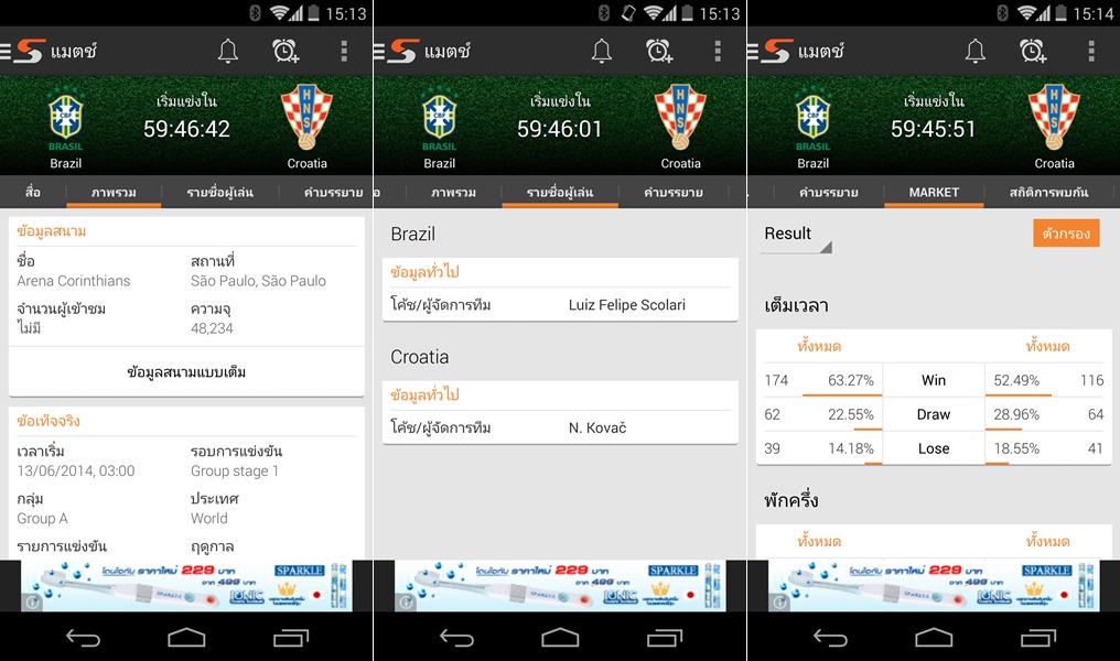 สำหรับการแข่งขันเราสามารถมาดูกับคู่แข่งได้เลยว่าผลการแข่งขันก่อนหน้าเป็นอย่างไร มีสถิติการทำประตูรวมทั้งการลงเล่นทุกแมตช์ว่าแข่งไปกี่ครั้ง ชนะกี่ครั้ง เสมอหรือแพ้กี่ครั้ง รวมทั้งระยะเวลาการนับถอยหลังแบบวินาทีว่าจะเริ่มแข่งเมื่อไหร่ ข้อมูลพวกนี้ช่วยเราได้มากเลยทีเดียว