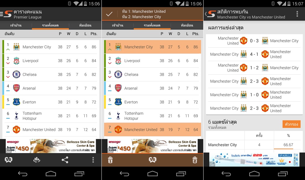 อย่างพรีเมียร์ลีกอังกฤษ (จริง ๆ ได้ทุกลีกเลย) ซึ่งผมเป็นแฟน Manchester United อยู่การสามารถเอาข้อมูลสถิติไปเปรียบเทียบกับทีมอื่นได้ (Head-to-Head) โดยการเลือกทีม 1 และทีม 2 เพื่อมาเปรียบเทียบกัน ก็จะได้ข้อมูลย้อนหลังในการพบกันแบบเจาะลึกเลยทีเดียว