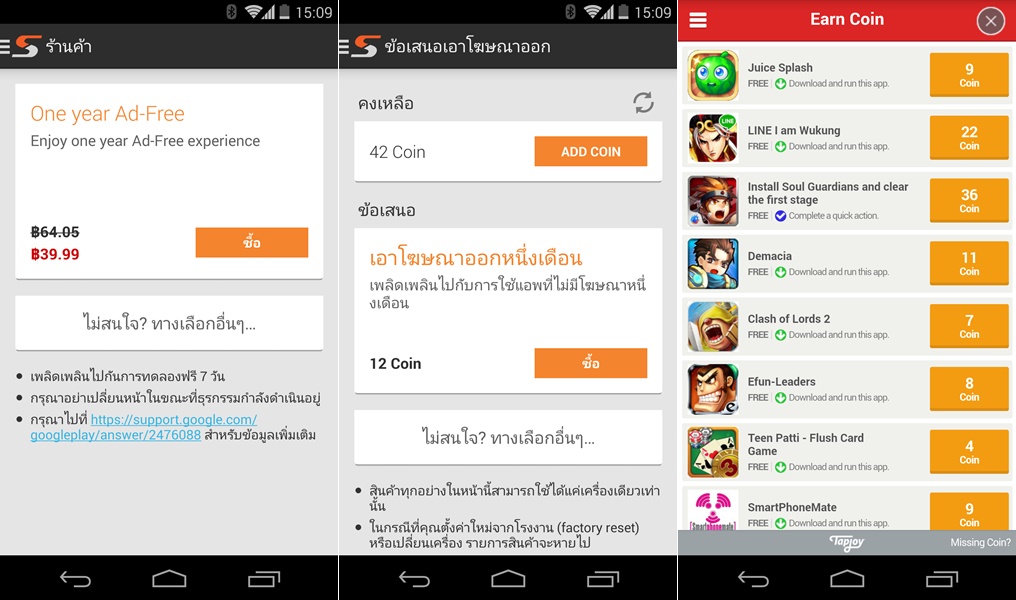 หรือ หรือ หรือ หากน้องคนไหนยังเรียนอยู่ยังไม่มีรายได้แต่ใจอยากอุดหนุนนักพัฒนาก็สามารถโหลดแอปฯ สปอร์นเซอร์ของ Tapjoy เพื่อแลกเหรียญแล้วเอาเหรียญพวกนี้มาแทนเงินในการเอาโฆษณาออกได้ด้วย (12 เหรียญต่อเดือนโหลดแค่แอปฯ เดียวก็ได้แล้ว)