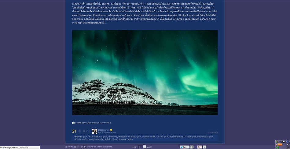 ไอเดียผมคือ ไหนๆ host ภาพเต็มขนาดแล้ว ก็อย่าให้เสียเปล่าครับ อยากให้ปรับปรุง Code เล็กน้อย ให้มุมภาพมีปุ่ม Full-screen ดูเต็มจอได้ แล้วกดเลื่อนซ้ายขวาไปยังภาพถัดๆไปของกระทู้ได้ หรือถ้าให้เทพอีกนิดก็ให้แสดงข้อความเมื่อเลื่อน Mouse ไปที่ขอบด้านใดด้านหนึ่งของหน้าจอ อะไรทำนองนี้ คล้ายๆกับ Flickr และอีกหลายๆเว็บ....
