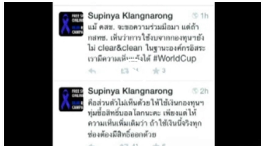 น.ส.สุภิญญา กลางณรงค์ กรรมการ กสทช. โพสต์ข้อความผ่านทวิตเตอร์ แสดงความไม่เห็นด้วยที่จะมีการเสนอเรื่องให้ กสทช.นำเงินจากกองทุนวิจัยและพัฒนากิจการกระจายเสียง กิจการโทรทัศน์ และกิจการโทรคมนาคมเพื่อประโยชน์สาธารณะ มาจ่ายชดเชยเพื่อให้ถ่ายทอดบอลโลกครบ 64 คู่ ผ่านช่องฟรีทีวีทุกช่อง โดยระบุว่าแม้ คสช. จะขอความร่วมมือมาถ้า กสทช. เห็นว่าการใช้งบจากกองทุนฯยังไม่ชัดเจนในฐานะองค์กรอิสระน่าจะมีความเห็นแย้งได้ เนื่องจากการพิจารณาใช้งบประมาณกองทุนฯ จำนวนมากต้องรอบคอบและผ่านการกลั่นกรอง ไม่เช่นนั้นอาจเข้าข่ายเป็นการเอื้อประโยชน์ธุรกิจได้
