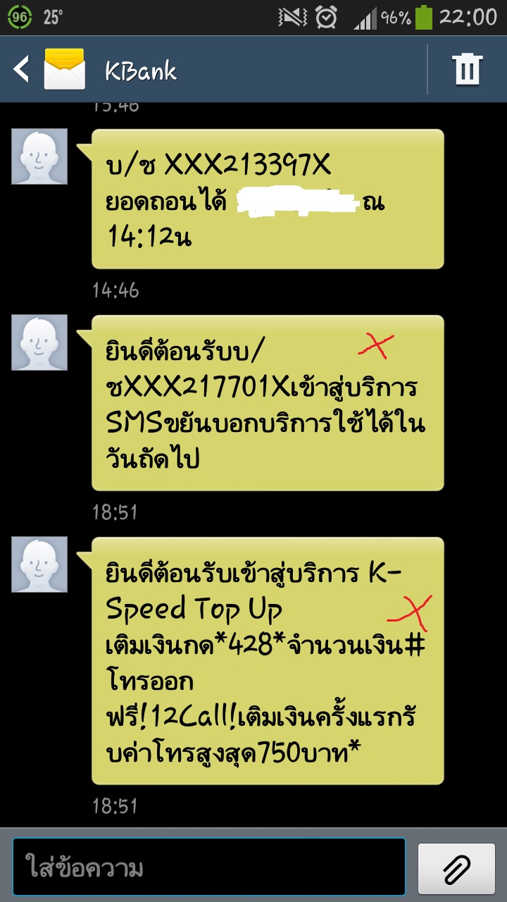 ข้อความล่าสุดที่ได้รับเป็นบริการเติมเงินมือถือทันใจกสิกรไทย (K-Speed Top Up) ซึ่งเป็นบริการที่ให้สามารถสอบถามข้อมูลด้านการเงิน เช่น ยอดเงินในบัญชี สอบถามข้อมูลบัตรเครดิต นอกจากนี้ยังสามารถให้บริการเติมเงินและชำระค่าโทรศัพท์มือถือ ชำระค่าสินค้าและบริการให้แก่ร้านค้าที่เปิดใช้บริการ K-Speed Top Up กับธนาคาร ซึ่งสามารถให้บริการแก่ผู้ใช้บริการโทรศัพท์มือถือทุกระบบ อาทิ AIS, dtac,True Move และ True Move H ทั้งแบบเติมเงิน (Pre-paid) และ แบบจ่ายรายเดือน (Post-paid) เพียงผูกเบอร์โทรศัพท์มือถือของลูกค้าเข้ากับบัญชีออมทรัพย์ หรือบัญชีกระแสรายวัน ก็สามารถทำธุรกรรมทางการเงินบนโทรศัพท์มือถือได้ทันที อัตราค่าบริการ SMS 1.5 บาท / รายการค่ะ