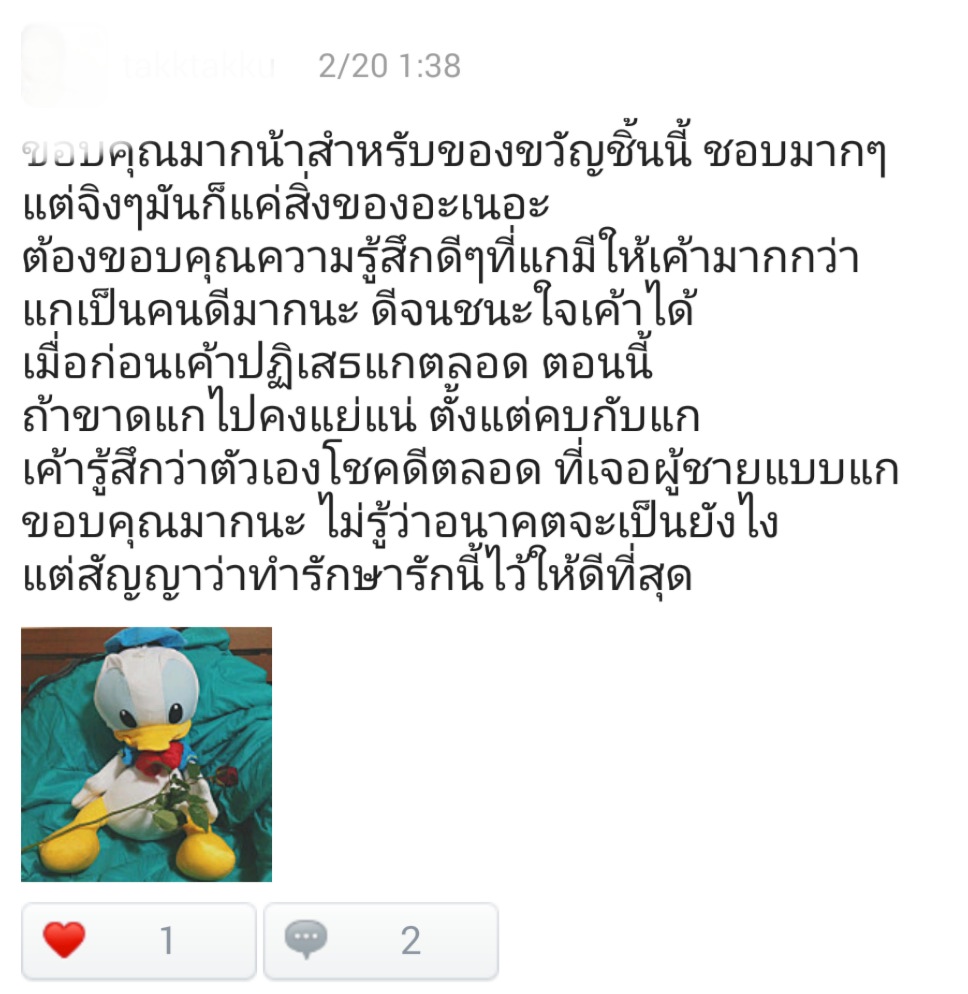 ของขวัญผมก็ซื้อให้ วาเลนไทน์ก็มีดอกไม้&ตุ๊กตา มีของนิดหน่อย เวลาอยุ่ด้วยกันเค้าไม่สบาย ผมก็ต้มน้ำอุ่นให้กิน ทำความสะอาดสายชาตอะไรให้ คือทำอะไรได้ผมก็ทำให้