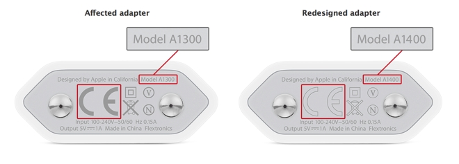 โดยอะแดปเตอร์ที่เข้าข่ายได้รับผลกระทบในครั้งนี้ จะระบุหมายเลขที่ด้านล่างไว้ว่า "Model A1300" และตัวอักษร "CE" เป็นสีเทาทึบ โดยตัวแทนจากแอปเปิ้ลได้กล่าวว่า "แอปเปิ้ลได้ถือเอาความปลอดภัยของลูกค้าเป็นสิ่งสำคัญสูงสุดเสมอมา และเราได้ตัดสินใจ (ด้วยความสมัครใจ) ที่จะแลกเปลี่ยนพาวเวอร์อะแดปเตอร์ที่เข้าข่ายได้รับผลกระทบ กับอะแดปเตอร์อันใหม่ โดยไม่เสียค่าใช้จ่ายใดๆ เราขอแนะนำให้ลูกค้า ทำการเปลี่ยนอะแดปเตอร์ที่เข้าข่ายได้รับผลกระทบโดยเร็วที่สุดเท่าที่จะทำได้"