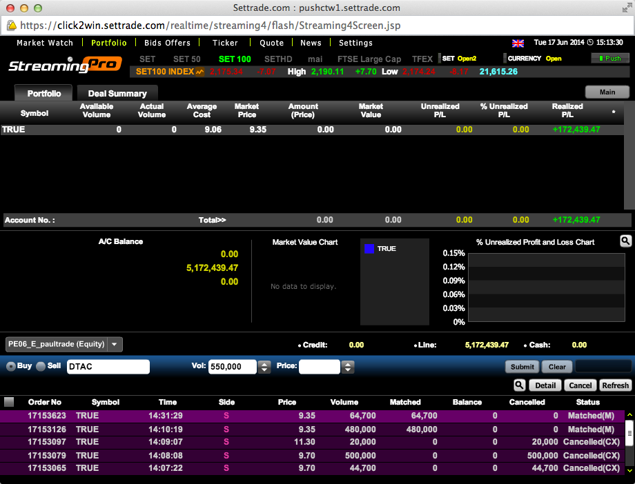 ผมก็ใช้Streamimg แล้วก็มีปัญหาโบรกก็บอกว่าให้ใช้ one click ก็หัดใช้ดูก็ดีครับ ใช้ได้ดีเลยที่เดียว มีกราฟแนบด้านข้าง ใช้ตัดสินใจเวลาว่าbid offer ไม่ต้องเปิดหลายจอ บ้างครั้งที่ streaming เดี้ยง oneclic