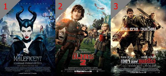 อันดับ 1 : Maleficent เป็นภาพยนตร์ที่ดัดแปลงมาจากแอนิเมชั่นสุดคลาสสิค Sleeping Beauty หรือ เจ้าหญิงนิทรา ซึ่งสะท้อนมุมมอง ความรู้สึกของแม่มดใจร้ายในแบบที่ไม่เคยเห็น แม้บทจะอ่อนไปนิด ความสมเหตุสมผลของเรื่องราวอาจจะไม่เด่นชัด แต่ต้องยอมรับว่าภาพและเอฟเฟคนั้น สวยงาม อลังการ บวกกับการแสดงของแองเจลีน่า โจลี่ ในบทบาทของมาเลฟิเซนต์ ก็ช่วยให้ภาพยนตร์เรื่องนี้น่าดูเป็นอย่างมาก แถมยังสามารถคงมนต์เสน่ห์แบบการ์ตูน Disney ได้อย่างครบถ้วน อีกด้วย
