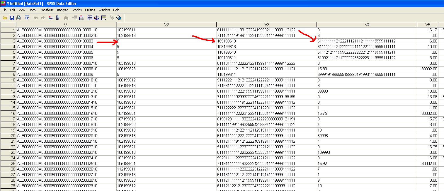 ทีนี้มาลองใช้ SPSS เปิด ปรากฎว่าข้อมูลมาครบ แต่มันแยกคอลัมน์ไม่ถูกต้อง ข้อมูลนึงมันโดดไปอยู่กับอีกคอลัมน์นึง
