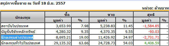 Sinthorn Summary 18/6/2557 : ต่างชาติขายสุทธิ -2,731.71 ลบ.