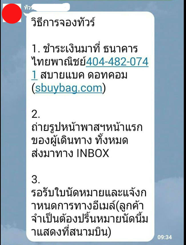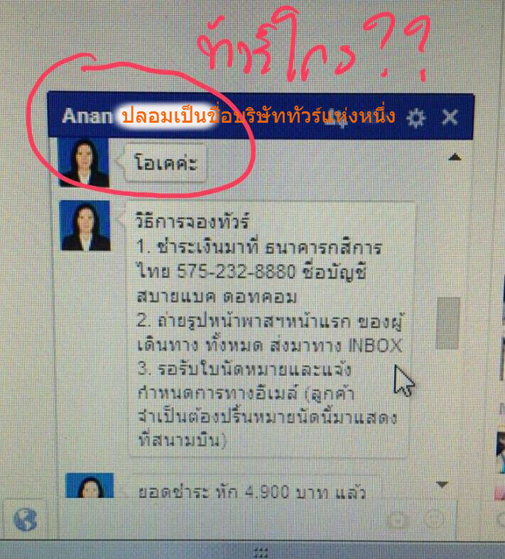 การติดต่อในบางครั้ง อาจมาทาง FACEBOOK โดยตั้งชื่อตัวเอง พร้อมพ่วงนามสกุล เป็น "บริษัททัวร์ชื่อดัง" เพื่อให้เหยื่อตายใจ ??