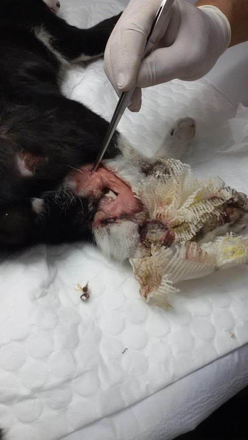 คือแมวเราเป็นลูกแมวอายุประมาณ2เดือนค่ะ แล้วโดนแมวใหญ่กัดบริเวณหว่างขา แผลฉีกแรงมากค่ะ เป็นแผลลึกเหมือนขาน้องฉีกด้วย เราใช้น้ำเกลือล้างแผล ใส่เบตาดีน แล้วก็โรยยาแก้อักเสบ น้องยังร่าเริงดี ขี้อ้อน แต่ยั