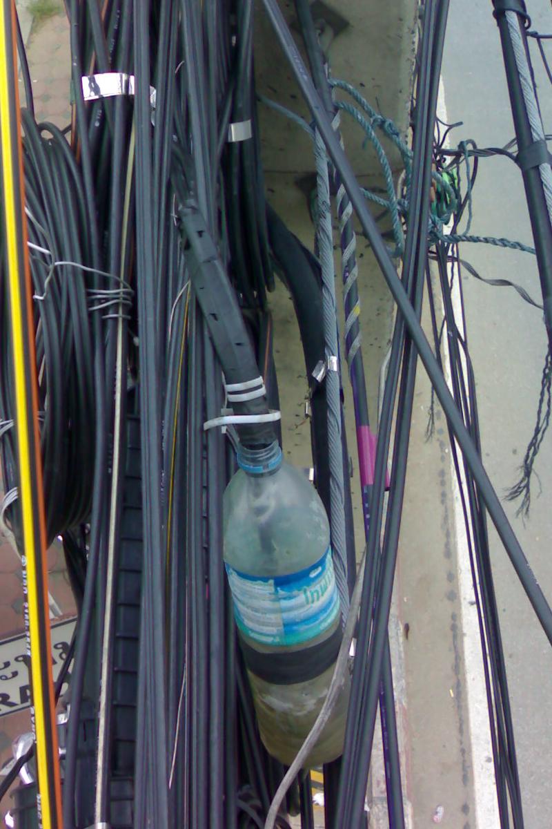 เหมือนจะเป็นสายอะไรซักอย่างเอาปลายใส่ลงในขวดพลาสติกแล้วพันเทปยึดติดไว้บนสายไฟ