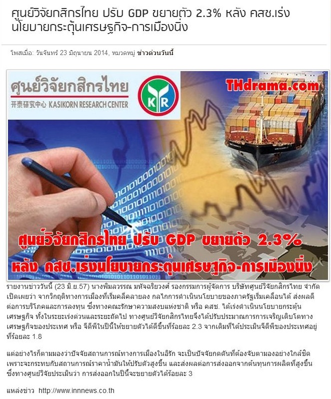 ศูนย์วิจัยกสิกรไทย ปรับ GDP ขยายตัว 2.3% หลัง คสช.เร่งนโยบายกระตุ้นเศรษฐกิจ-การเมืองนิ่ง