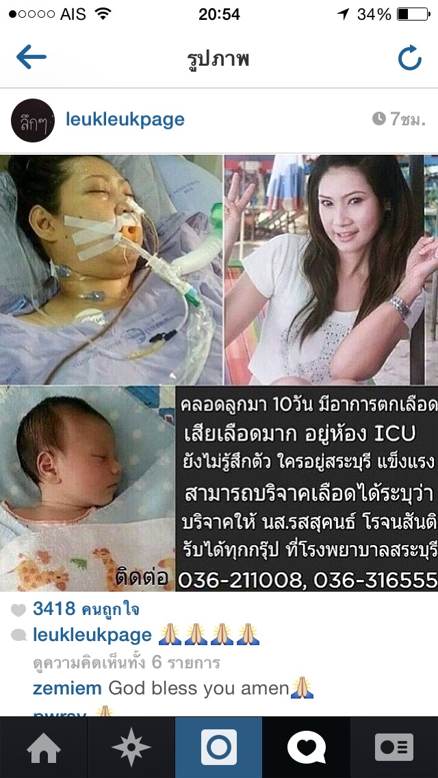 ตอนนี้คุณพ่ออยู่ในห้องICUที่โรงพยาบาลธรรมศาสตร์ คุณหมอบอกว่าอาการวิกฤต ถ้าเกล็ดเลือดลดลงอีกจะช่วยไว้ไม่ได้ แต่ทางรพ.เกล็ดเลือดขาด เลยอยากขอความกรุณาท่านที่มีเลือดกรุ๊ปบี และสะดวกสามารถบริจาคเลือดได้