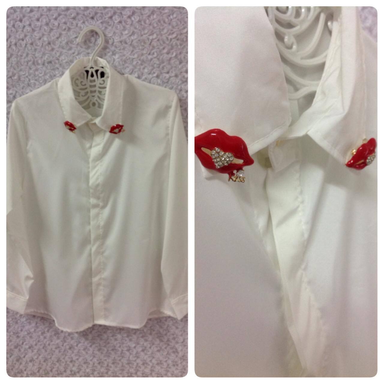 เสื้อเชิตสีพื้น ดำ ขาว แต่งเข็มกลัดรูปปากตรงปกเสื้อ 150฿