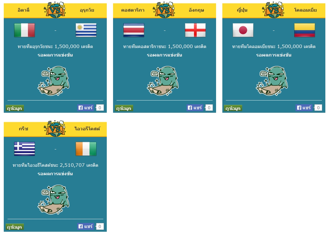 ทายสกอร์คืนนี้ค่ะ อุรุกวัย คอสตาริก้า โคลอมเบีย ไอวอรี่โคสต์ เข้าวินค่ะ