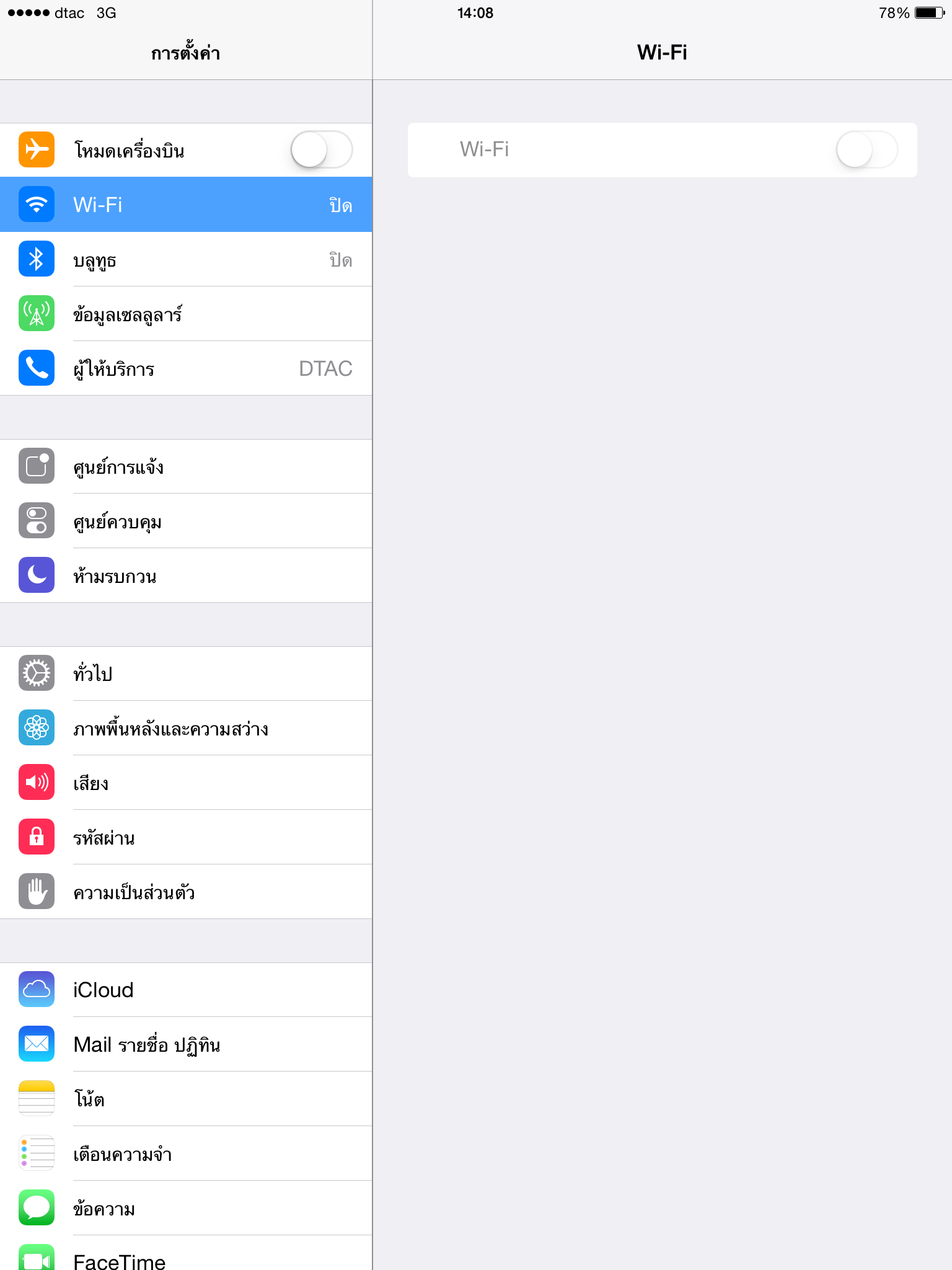 เริ่มแรกเราอยู่บ้านก็เชื่อมต่อWiFiที่บ้านเล่นตามปกติ ซักพักรู้สึกเน็ตช้าเลยมองไปที่สัญลักษณ์สัญญาณWiFi ก็เห็น3Gขึ้นแทนสัญลักษณ์WiFi ก็เลยเข้าไปที่การตั้งค่าเพื่อจะกดเชื่อมต่อสัญญาณใหม่(ก่อนหน้านี้ก็มีปัญหาบ้างแต่ไม่ถึงกับบ่อย WiFiชอบหลุดเองต่อเองบางครั้งต้องไปกดหน้าการตั้งค่าถึงจะเชื่อมต่อใหม่) แต่ครั้งนี้เราเปิดไปหน้าWiFiรอมันค้นหาสัญญาณนานมาก ก็หาสัญญาณWiFiบ้านเราไม่พบ ลองกดใหม่หลายรอบก็ค้นหาไม่พบ ตอนแรกก็นึกว่าเป็นที่ตัวเราท์เตอร์บ้านเรารึเปล่า แต่พอลองถามแฟน..แฟนบอกiphoneก็ขึ้นเชื่อมต่อWiFiปกติดี เราก็เลยลองปิดเครื่องเปิดใหม่..**ทีนี้หนักกว่าเดิม (><)" กดเข้าไปที่การตั้งค่าWiFi ปุ่มเปิดWiFiเราเลื่อนเปิดไม่ได้เลย มาลองเปิดบลูทูธปุ่มก็เปิดเลื่อนได้ตามปกติ มีWiFiที่กดเลื่อนเปิดไม่ได้ (ตามรูปเลยค่ะ vvv)