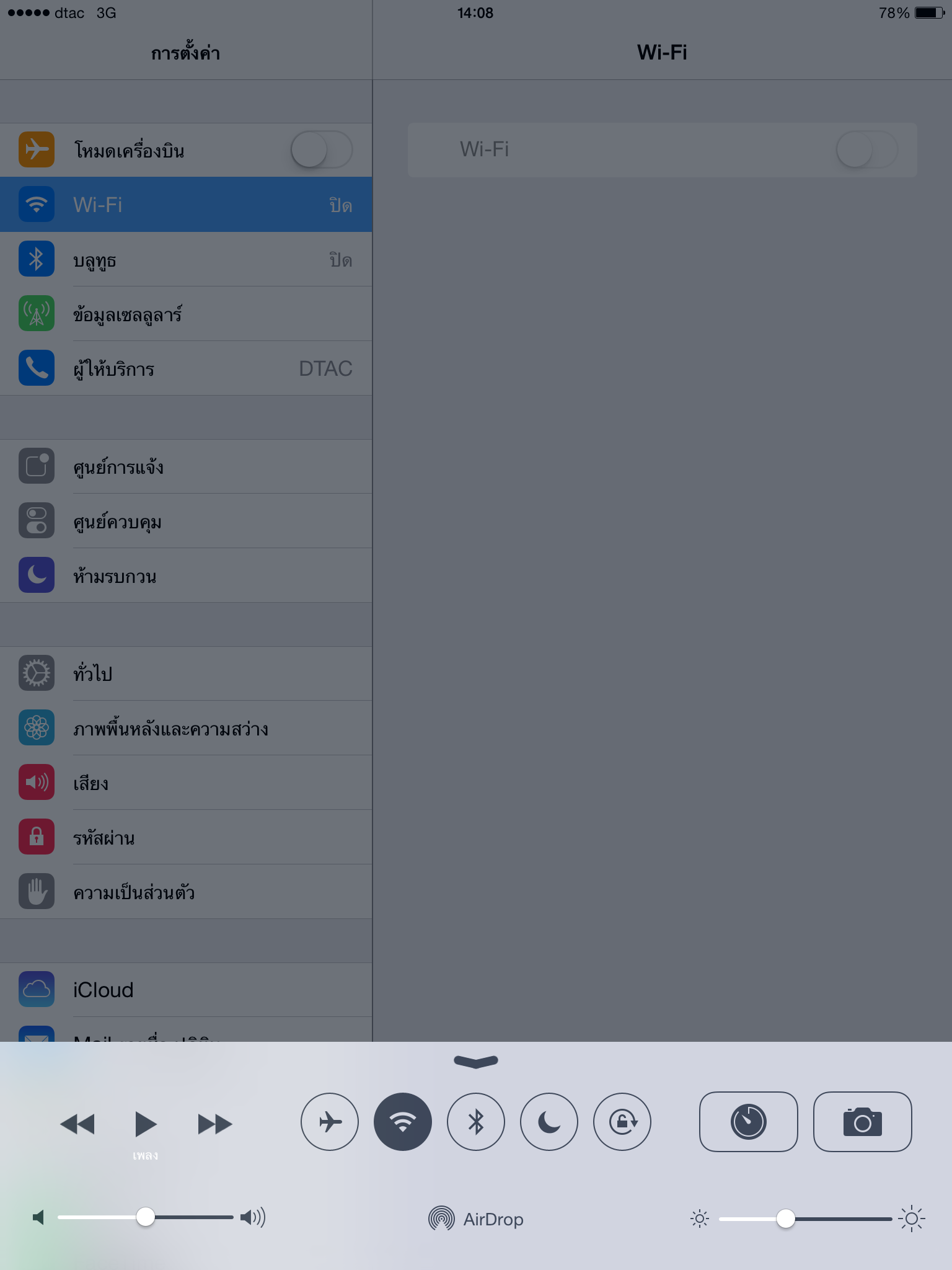 เราก็เลยลองรีเซ็ตการตั้งค่าเครือข่าย..ก็ยังไม่หาย ทีนี้เลยลองรีเซ็ตการตั้งค่าทั้งหมด..ก็ยังไม่หายอีก ลองกดเลื่อนแถบเครื่องมือด้านล่างขึ้นก็พบว่าตรงสัญลักษณ์WiFiเป็นสีเทาเข้มๆทึบๆ(ปกติถ้าเปิดใช้งานจะแค่เปลี่ยนจากสีเทาเป็นสีขาว)พอลองกด..ก็ขึ้นที่หน้าจอว่า "ไม่มี Wi-fi" (ตาม2รูปล่างเลย vvv)