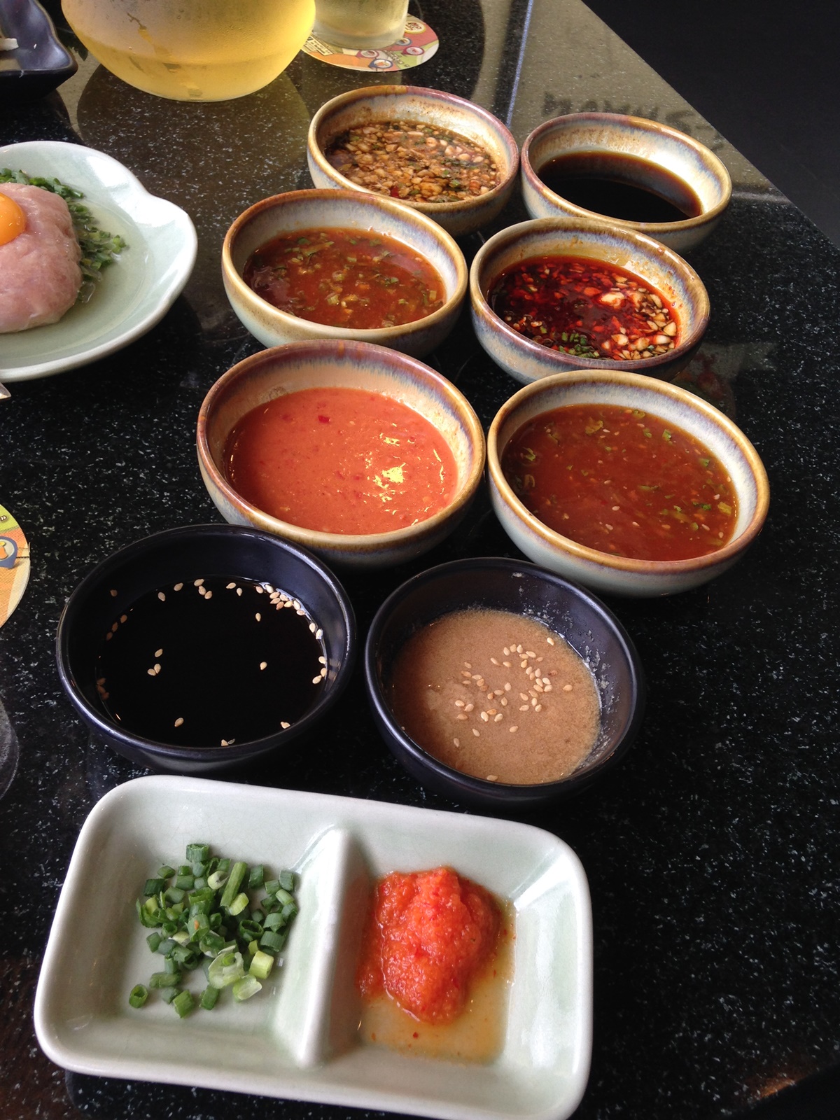 เห็นในเมนูมีน้ำจิ้มหลายแบบเลยถามน้องพนักงานว่าขอทุกแบบเลยได้มั้ย น้องเค้าก็จัดมาให้เลยครับ น้ำจิ้ม7แบบ สุดยอดเลย