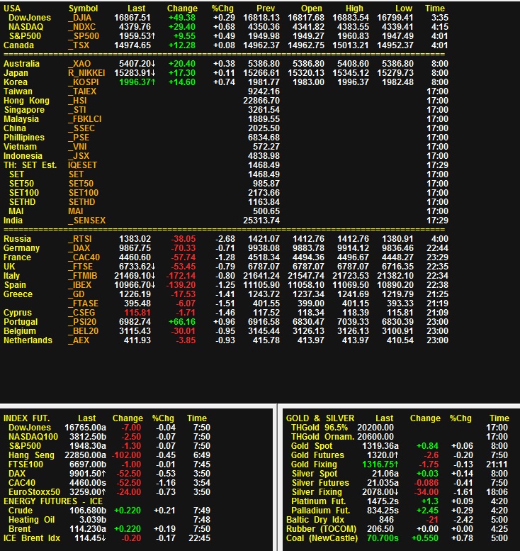 สัญญาล่วงหน้าน้ำมันดิบชนิดไลต์สวีตครูดของสหรัฐฯ งวดส่งมอบเดือนสิงหาคม เพิ่มขึ้น 47 เซนต์ ปิดที่ 106.50 ดอลลาร์ต่อบาร์เรล ส่วนเบรนท์ทะเลเหนือลอนดอน งวดส่งมอบเดือนเดียวกัน ลดลง 46 เซนต์ ปิดที่ 114.00 ดอลลาร์ต่อบาร์เรล
