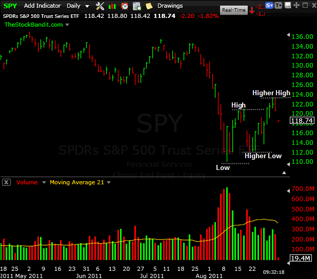 ทัศนคติมุมมองต่อภาวะกระทิงนั้น พวกเราก็หวังในเรื่องราคาหุ้นที่ปรับตัวเพิ่มสูงขึ้นมากกว่า ซึ่งจะต้องมีสัญญาณที่แน่ชัดก่อนว่าสัปดาห์นี้ปรับตัวเพิ่มสูงขึ้นหรือไม่ พวกเราก็จะต้องเข้าไปเล่นหุ้นหลังจากที่ราคาหุ้นปรับตัวขึ้นในเวลาสั้นๆ โดยจุดเปลี่ยนมันอยู่ตรงที่ราคาหุ้นได้ทำ Higher Low กับ Higher High และพวกเราก็เห็นแล้วว่ามันเป็นแบบนั้นจริงๆ