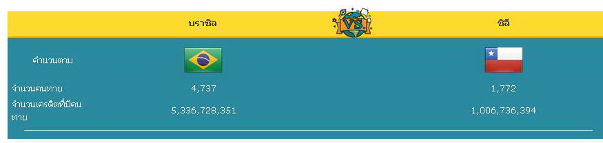 บราซิล ทาย 100,000 ถ้าถูกได้ 118,864 รวมทุน (หรือ จ่ายไป 1 ได้คืน 1.188) ประมาณเท่าเดิม เทียบกับ 6 ชั่วโมงก่อน