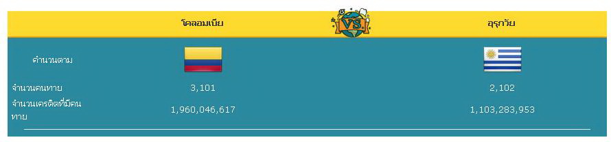 โคลอมเบีย ทาย 100,000 ถ้าถูกได้ 156,289 รวมทุน (หรือ จ่ายไป 1 ได้คืน 1.562) เรตได้เพิ่มขึ้น เทียบกับ 6 ชั่วโมงก่อน