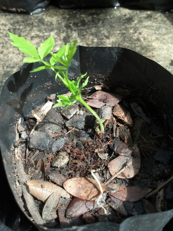 ต้นนี้ขึ้นมาเองมีหลายต้นเลยค่ะ คาดว่านกพามาค่ะ ใบหยักสวยมีดอกเล็กๆ ส่วนผลบีบลงไปมีแต่ลมแกะออกมามีเมล็ด เท่าถั่วลิสงเหม็นเขียวค่ะ ตามรูปค่ะ (ถ้าเป็นวัชพืชจะได้รีบถอนออกค่ะ)