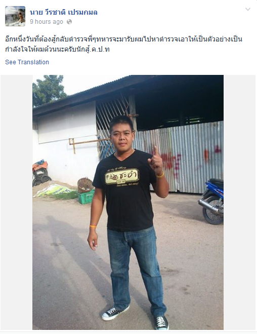 ทั้งนี้ สืบเนื่องจากวานนี้เจ้าตัวถูกตำรวจกำแพงเพชรไม่ใส่เครื่องแบบ 5 คน รวบตัวเข้าโรงพักโดยไม่มีหมายจับ อ้างลูกพี่อยากเจอ เพื่อถามว่า “เปลี่ยนสีเสื้อทำไม พวกมันให้อะไร..เหรอ” ก่อนปล่อยตัวกลับยังกลั่นแกล้งสั่งตรวจปัสสาวะหาสารเสพติด ตอนแรกระบุว่าฉี่สีม่วง โชคดีมีตำรวจน้ำดีแย้งว่าฉี่ไม่ได้สีม่วงจึงรอดตัวออกมาได้