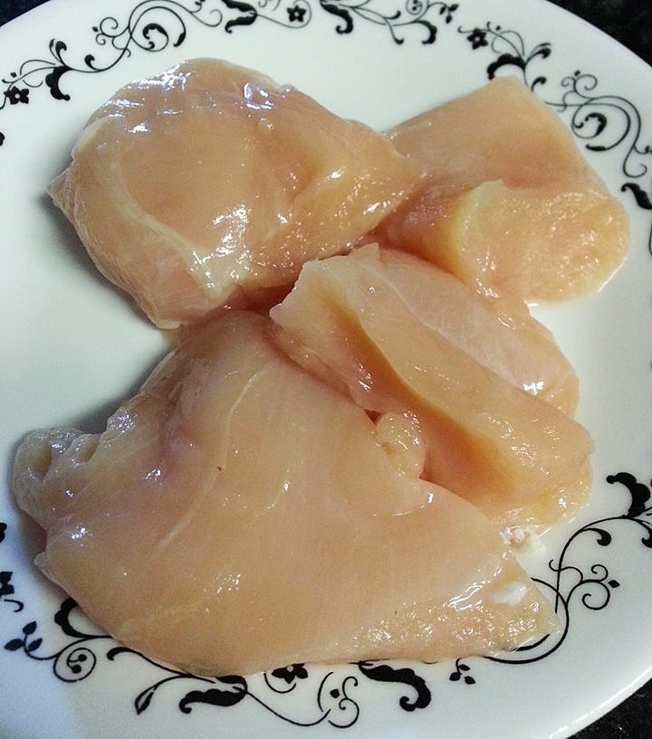 มาเริ่มทำกันเลยดีกว่าค่ะ อย่างแรกเลยมี๊ก็เตรียมอกไก่ เลาะมันออกให้หมดเลยนะคะ