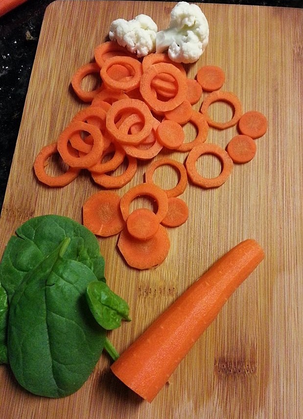 เตรียมผักหั่นแครอท ผักกระหล่ำแล้วผักโขมนิดหน่อยค่ะ วันนี้มี๊เพิ่งจะลองให้หนูกินครั้งแรกเลยให้ลองก่อนค่ะ