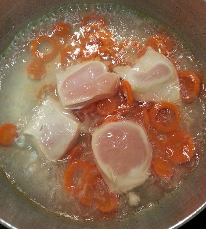 จากนั้นก็เอาน้ำใส่หม้อตั้งไฟให้เดือดจัดการใส่ไก่ ใส่แครอทเลยค่ะ