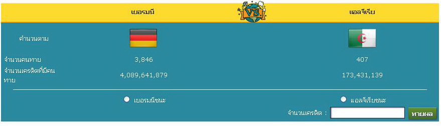 ถ้าทายเยอรมนี 1 เครดิต ทายถูกจะได้ประมาณ 1.04 เครดิต รวมทุน... ได้กำไรร้อยละ 4 เอง แพ้เสียหมดเลยนะ