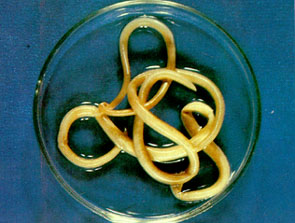 ปรากฏว่าเจอตัวพยาธิครับ แล้วมันก็ไม่ใช่เจอแค่ตัว 2 ตัว นะครับ ไส้พวงเดียวเจอเกือบ 10 ตัว