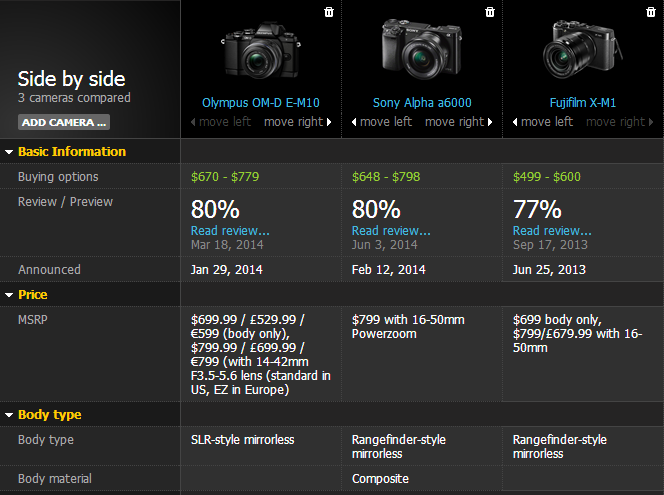 http://www.dpreview.com/products/compare/side-by-side?products=oly_em10&products=sony_a6000&products=fujifilm_xm1&sortDir=ascending