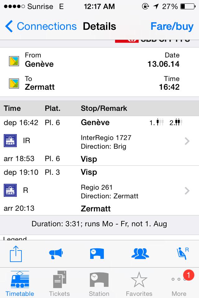 เค้าก็จะขึ้นมาให้ว่ามีรถรอบไหนบ้าง ก็ให้กดเลือกเข้าไปก็จะขึ้นหน้าแบบนี้มาค่ะ เค้าจะบอกหมดเลยว่าเปลี่ยนรถที่ไหน เวลากี่โมง Platform ที่เท่าไหร่ ซึ่งรถไฟที่สวิสค่อนข้างตรงเวลาทีเดียวค่ะ มีเลทบ้างนิดหน่อย (แต่เลททีก็งานงอก ฮ่าๆ T-T)