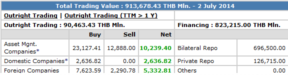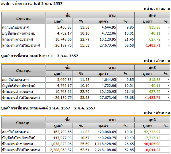 เว็บไซต์ตลาดหลักทรัพย์แห่งประเทศไทย รายงานสรุปการซื้อขายหลักทรัพย์ โดยแบ่ง ตามประเภทนักลงทุน ประจำวันที่ 4 มีนาคม 2557 ดังนี้ กลุ่ม ปริมาณซื้อ % ปริมาณขาย % สุทธิ (ลบ.) (ลบ.) (ลบ.) นักลงทุนสถาบัน 1,7